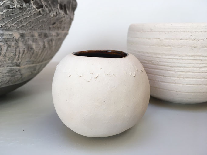 Ich orientiere mich mit meinen Keramiken an weichen, fließenden Oberflächen, die ich mit Erdtönen als Finish ergänze. Aus dem Bedürfnis heraus, einen optischen Kontrast zu Technik und