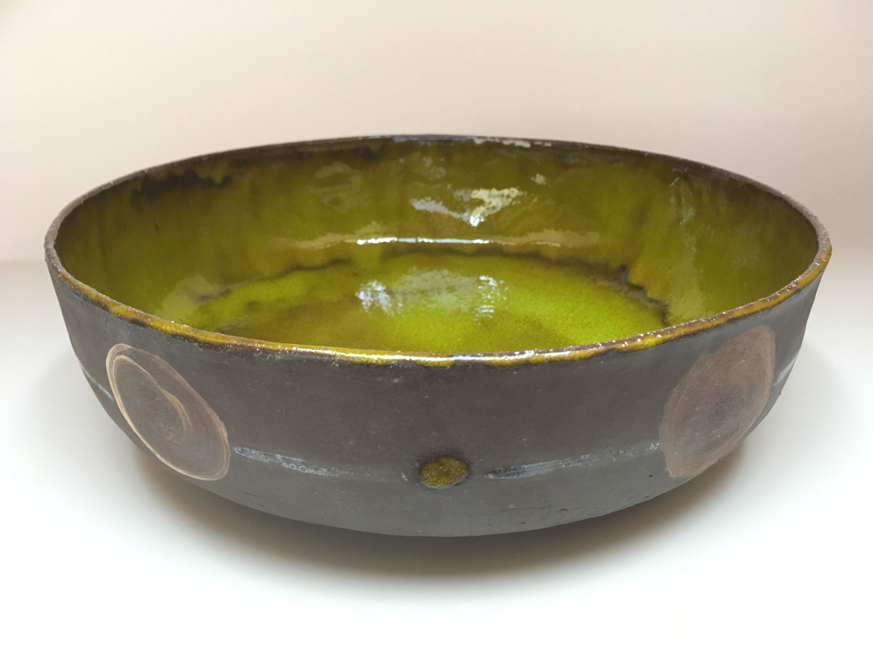 runde Schale mit grüner Glasur innen, außen unglasiert mit Slip und leicht hellblau