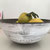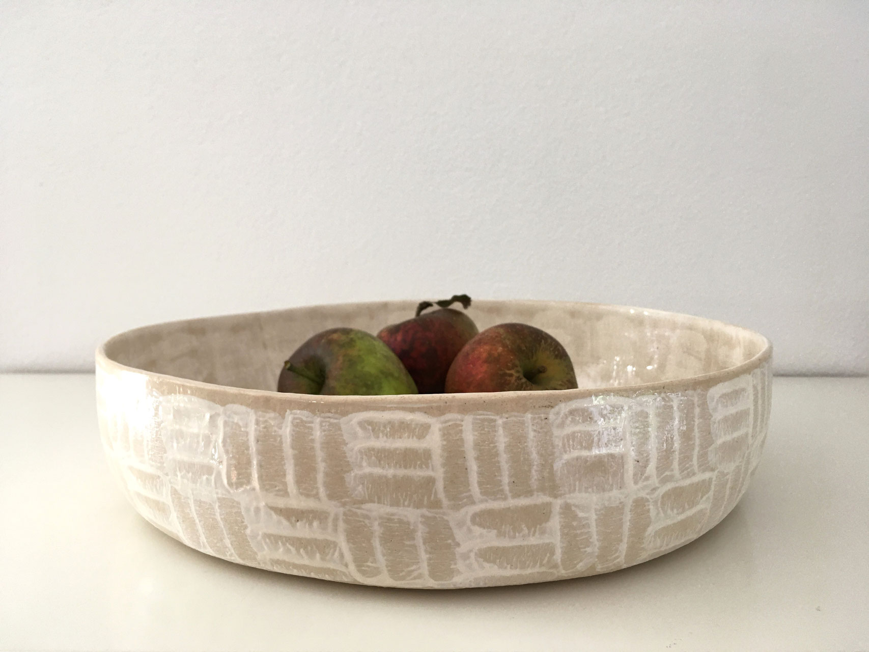 shaped and textured, sanft gerundete Schalenform mit tuchähnlicher Oberfläche und Randmusterung innen, unglasiert